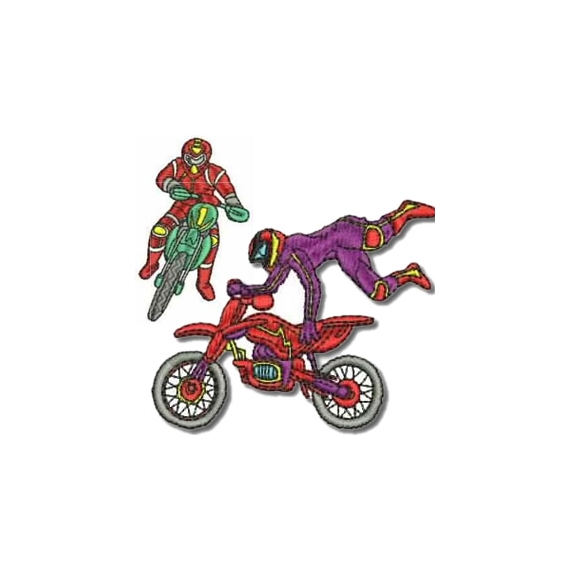 5 set of designs, motocross and jump bikes having fun. High quality, affordable and available in most embroidery machine formats at low cost ready download.