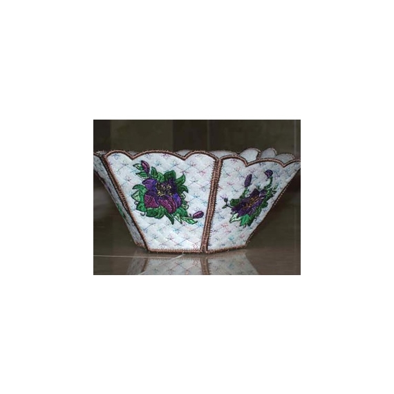 A set of designs 6 sides and 1 base that when stitched out onto suitable stabilizer can be sewn together to make a beautiful free standing bowl.