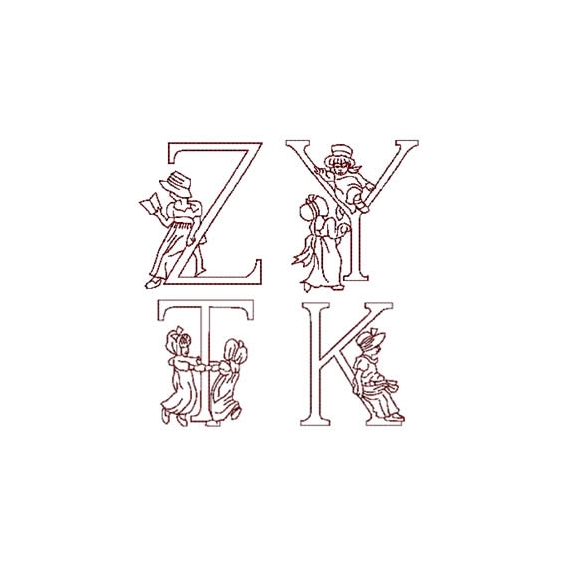 Pretty child redwork font very effective on plain color fabrics. 26 alphabet letter designs.