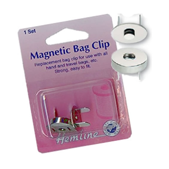 The magnetic bag clip is an ideal fastening for a handbag, the clip itself making the fastening easier, with large clip size and the magnetic parts holding the clip together firmly. The magnetic bag clip is easy to use, simply mark the position of the fastener, and cut two small slits to push through the prongs (it is a good idea to use a small piece of iron on interfacing on the rear of the fabric where the clip is attached for strength), push the prongs through and slip the washer on the rear of the fabric, then press back the prongs to secure in place.