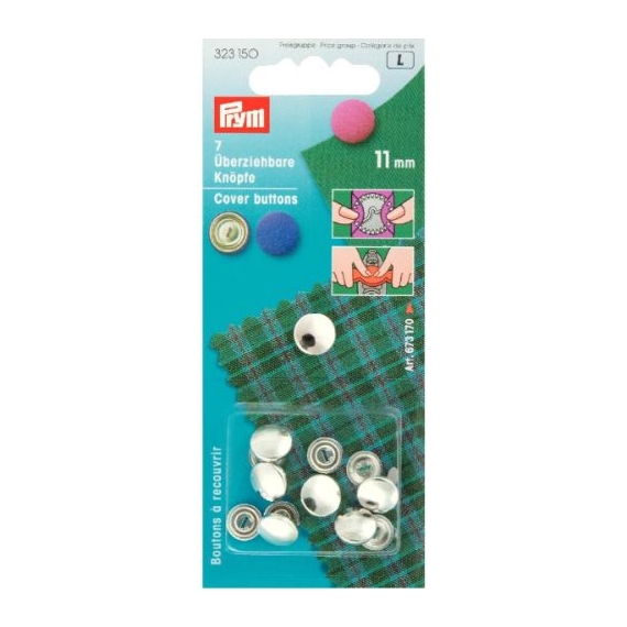 Premium quality as always by Prym. Made out of Brass and finished in a shiny Silver and ideal for upholstery jobs, these 11mm cover buttons come in a pack of 7.