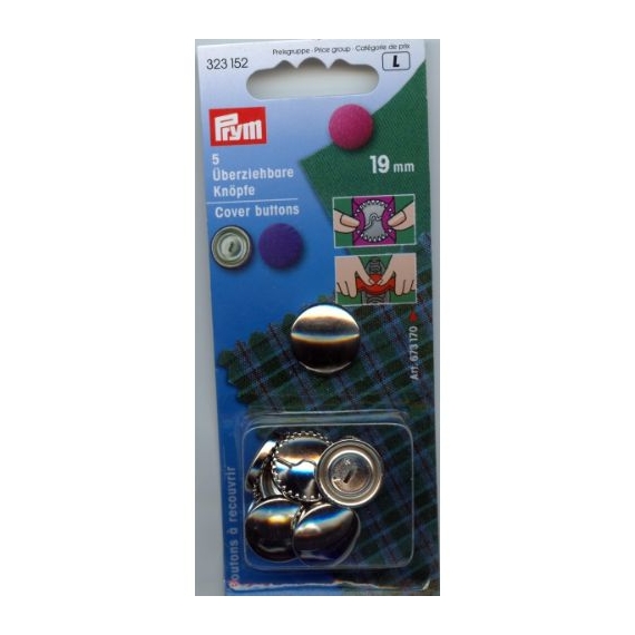 Premium quality as always by Prym. Made out of Brass and finished in a shiny Silver and ideal for upholstery jobs, these 19mm cover buttons come in a pack of 5.