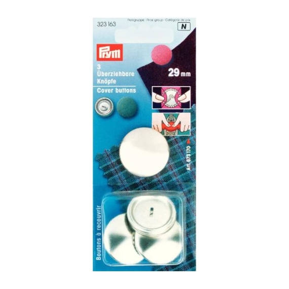 Premium quality as always by Prym. Made out of Brass and finished in a shiny Silver and ideal for upholstery jobs, these 29mm cover buttons come in a pack of 3.