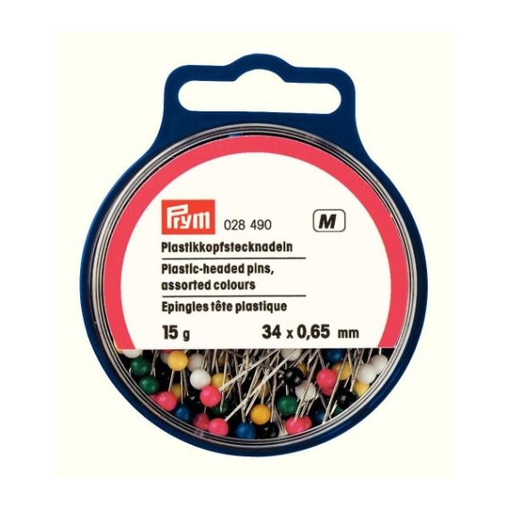 Premium quality as always by Prym. Plastic headed Assorted colour pin are strong and for general purpose household use. Come in a resealable tub the pins are standard length pins at 34mm long and 0.65 mm thick.