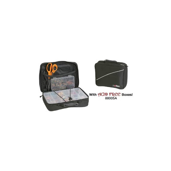 The ArtBin Quick Zip 8800SA Includes (1) 2003AB and (1) 4006AB Solid fully padded construction. Secure zipper closure and rubber grip carrying handle. Mesh pocket in "lid" accommodates added supplies. Bungee cord with toggle securely holds Solution box supplies in place. Secure zipper and carrying handle. Convenient easy to carry satchel styling. Multi storage, holds small as well as large supplies.