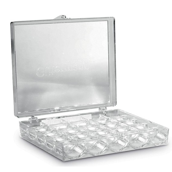 Clear Plastic bobbin storage box hold 25 standard bobbins suitable for most Singer, Toyota, Brother, Frister Rossmann, Jaguar, Juki, Silver Viscount, Janome and Elna sewing machine, also Pfaff smarter, ambition & Passport and Husqvarna H Class.