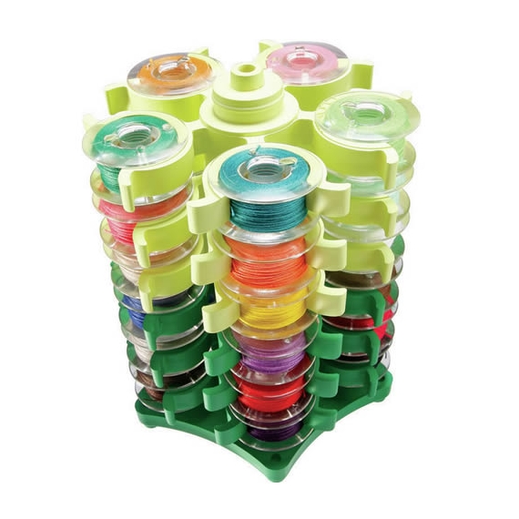 Fits almost every type of bobbin except the Bernina Jumb Bobbins. The stack 'N Store bobbin tower hold up to 30 bobbins, keeps loose end wrapped up tightly and nice and neat. The sections are rmeovable so that you can get easy acces to any of the stored bobbins.