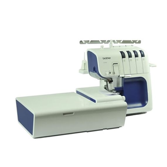 The Brother overlock machine extension table increases the size of the sewing area and also doubles as a handy storage area. As the image shows the lid can be lifted and used as a storage area for sewing accessories.