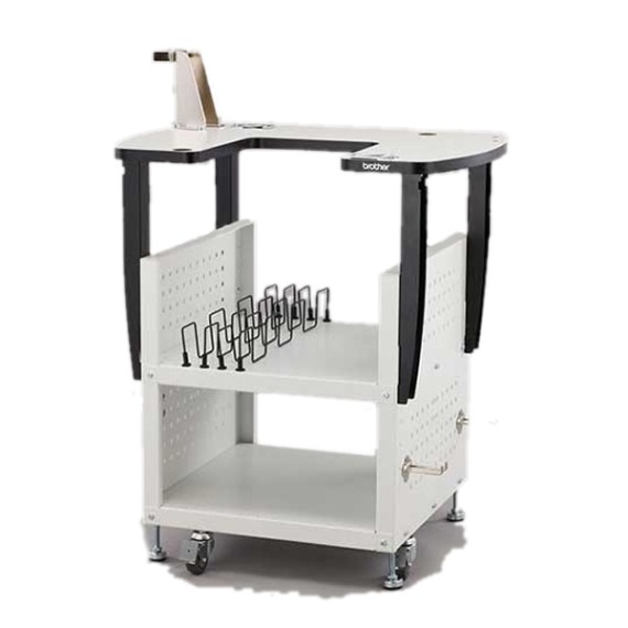 This mobile stand securely holds any one of the PR and VR range of embroidery machines and provides plenty of room to store accessories and threads.