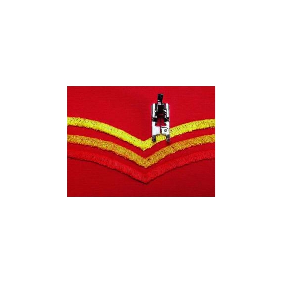 Both functional as well as decorative. Also known as a tailors tacking foot you can create tailor tacks, fringe, hair, chenille effects, faggoting (bridging), etc. Using this Elna fringe or looping foot you'll notice the metal extension raises the thread off the fabric surface for a dynamic surface texture treatment. As its name implies, the fringe foot will also make fringes for craft and decorative work.