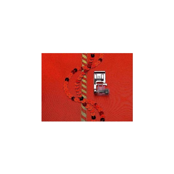 Spice up your designs with ribbons and sequins, use this Elna ribbon and sequin foot by effortlessly couching them onto fabric with a simple zigzag or a more intricate stitch. The front opening in the foot is an adjustable guide that ensures the ribbon or sequins lie flat. Make lovely ribbon or sequin effect on your drab clothing..!