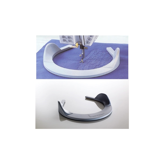 The Free motion Guide grip is perfect for guiding a quilt or fabric when free motion sewing, quilting or embroidering. The surface on the underside of the guide grip holds the fabric taut and provides handles for moving fabric in any direction.