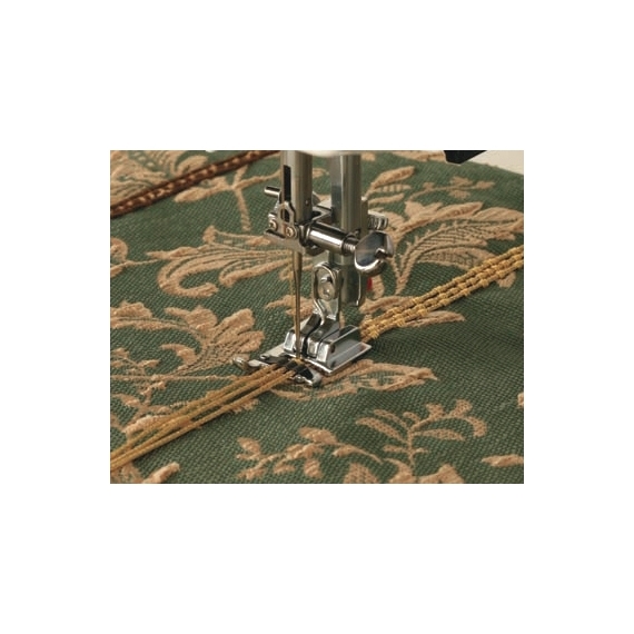 The 3-way cording foot will hold one, two or three fine cords or threads. Because they are attached to the foot, the required design can be easily followed and the cords are perfectly placed. A variety of utility or decorative stitches can be sewn over the cords to couch them onto base fabrics. The choice of cord, thread and stitch are all contributory factors to the final effect. Feet Janome 3 way Cording Foot models