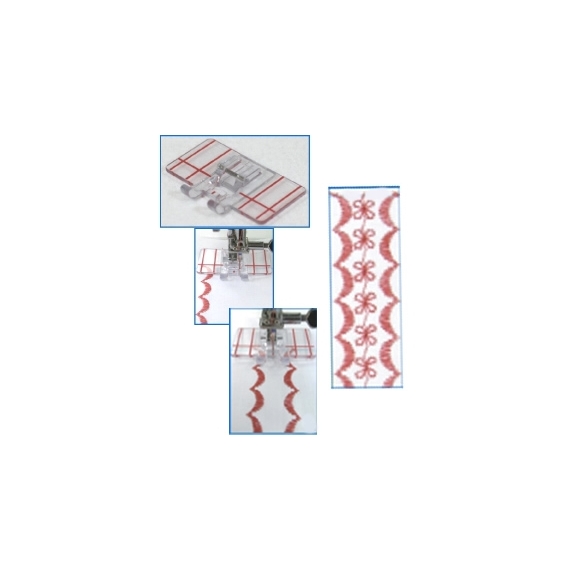 Having problems lining up or evenly spacing your border designs... Now the Border Guide Foot helps you to easily match up your border designs with the red lines of the foot. No need to mark every row beforehand! The secret to the border guide foot lies in the red guide marks. The two sets of vertical red lines are calibrated to allow perfect spacing of rows. The horizontal red line matches the needle drop so you can line up the start of each row. The small red mark denotes the centre of the design for lining up with the marking for the first row.