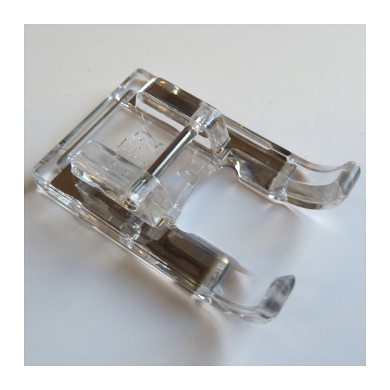This foot is clear and has an open front. It makes viewing the needle, fabric and stitches while sewing much better. It is just the correct width and has a cut-out on its sole to allow thicker stitches to pass under with-out interfering with the decorative stitch patterns. It is best to use this foot when sewing applique, or other intricate stitching tasks.