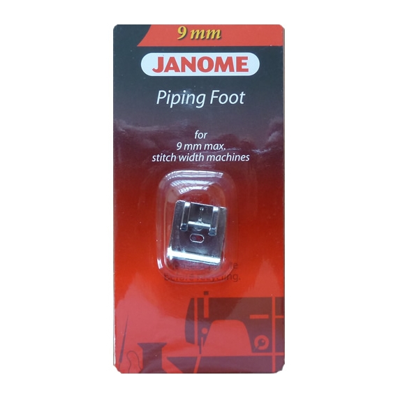 Used for attaching piping cord. Its it the exact same foot the professionals use when adding fancy piping to your cushions or 3-peice suite. Piping adds the extra finishing touch to home decor projects. This foot is for Janome sewing machines that have a 9 mm zig-zag stitch width. The left or right cut-out under the foot helps keeps the fabric wrapped around the cord in place, while the machine sews it firmly in position.