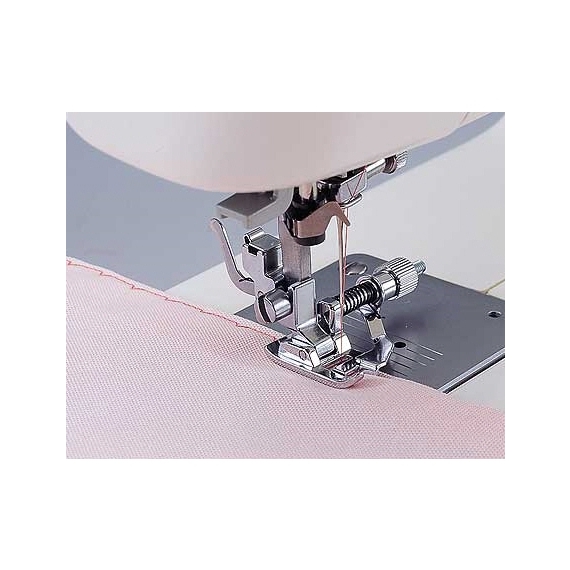 Blind hemming can sometimes be a little bit tricky so the blind hem foot goes some way to helping improve this technique. This foot has a metal adjustable guide in the centre and three grooves on the underside. During blind hemming, the fold of the fabric fits snugly against the guide in the foot for accuracy while the grooves underneath help to prevent unnecessary slipping. The needle swings over the metal guide creating slack in the upper tension so that the pick of the stitch is almost invisible.Janome Adjustable Blind Hem Foot