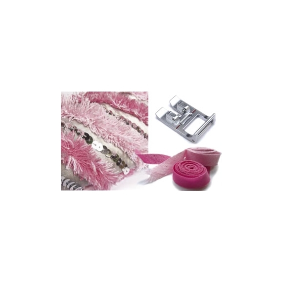Embellish your project with chenille effects by using the Chenille Foot. This foot will easily guide and stitch layers of chenille strips or loose woven fabric strips wherever you want a chenille effect. Brush the loose edges to create lovely fluffy look.Pfaff Chenille Foot