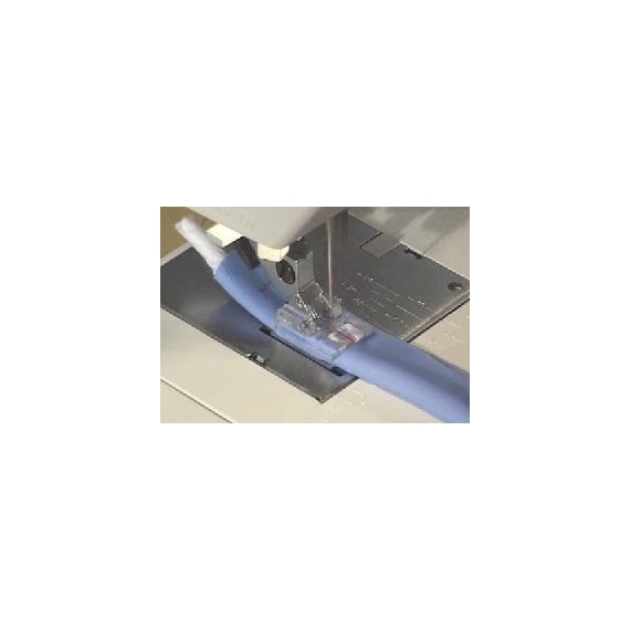 To stitch covered welt cord into a seam on your sewing project, place the covered welt cord on the right side of the fabric along the seam line. Place it under the Welting foot with the welt cord in the groove of the foot. Stitch the welt cord to the fabric.