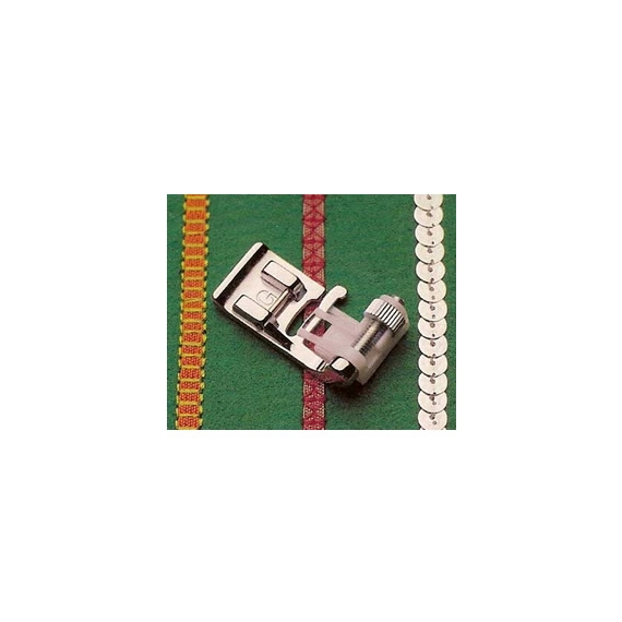Ribbon and Sequin Foot snap on type suitable for many Janome sewing machines. As with beads and pearls it is now so much easier to attach ribbons and even sequins with the help of our special ribbon/sequin foot. This foot is designed with guides through which ribbon or sequins can be inserted and it will allow them to feed through evenly as you sew.