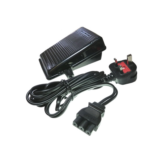 The sewing machine speed controller. This Silver Viscount foot control and lead will has the electronic type foot pedal for best speed control and is supplied with UK 3 pin plug.