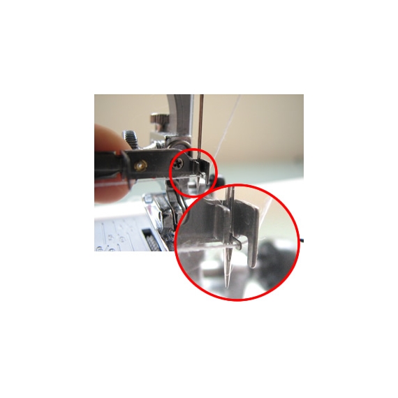 The threading pin is easily bent, please take care when fitting. This needle threader is the small metal guide including the threading hook, it screws into place on the needle threading arm.