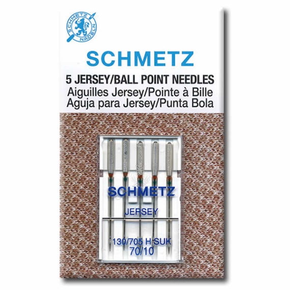 The ball point jersey needles have slightly rounded tips that allow them to go between the material threads of knitted fabrics, rather than pierce them. This prevents runs, snags and skipped stitches. Similar to the Schmetz "stretch" needles but especially for sewing on knits. The medium ball point does not damage or break knitted fibres.