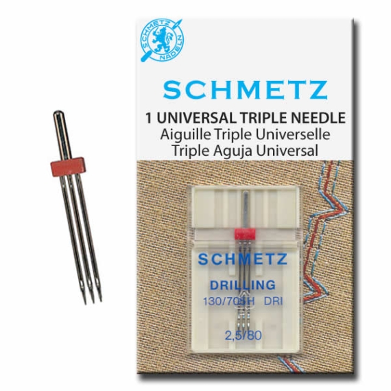 Now it is possible to stitch just like the professionals, even when they are using industrial machines costing £3000 to produce the exact same result. This triple or drilling point needle has one shank, but 3 needle points and eyes.