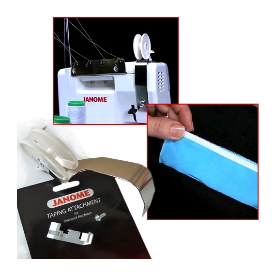 The tape reel arm is fitted to the rear of the overlocker, so the reel is at the front as shown in the image. The tape is then wound on to the reel and passes through the tape hole in the arm, then through the tape hold in the special foot. Set the machine as normal using 3 or 4 threads and as you stitch the tape will be pulled through and sewn flat against the fabric. The sewn will now become stable and will not stretch!