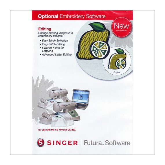 This is the Singer addition editing software to the original Futura base software, edit shape of section, edit stitch-by-stitch, apply pre-set or custom fill types, plus much more editing functions. Available for the CE 150, CE 250, CE 350 and XL400 XL550